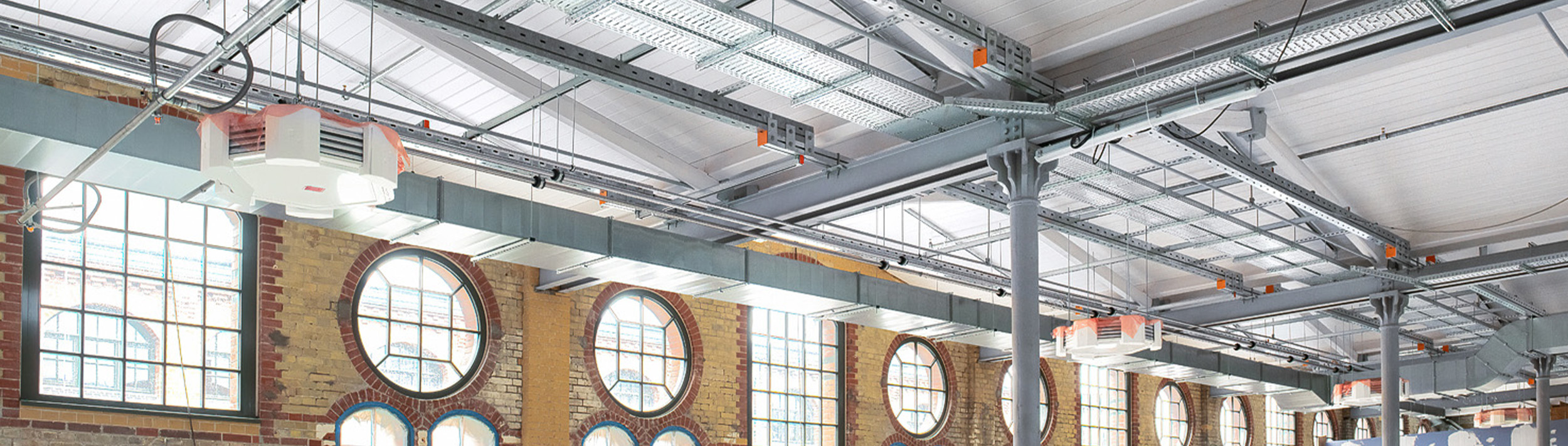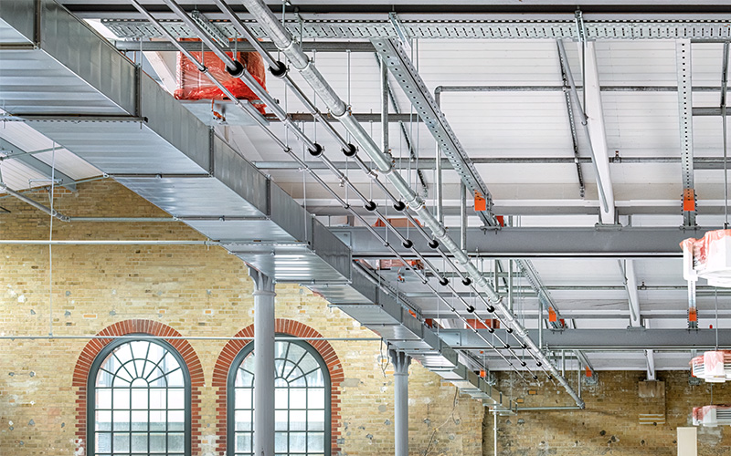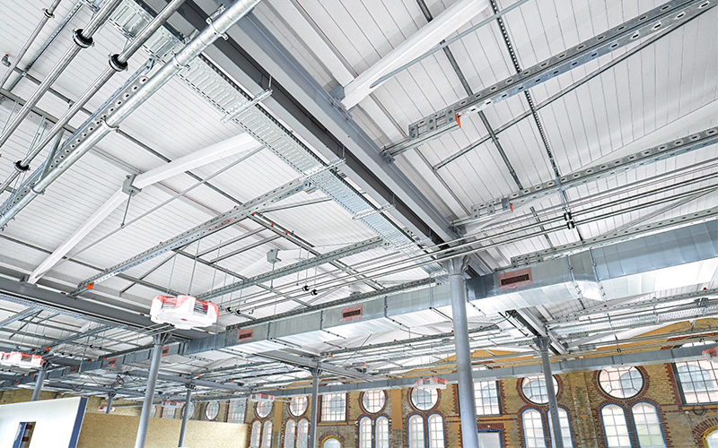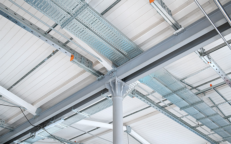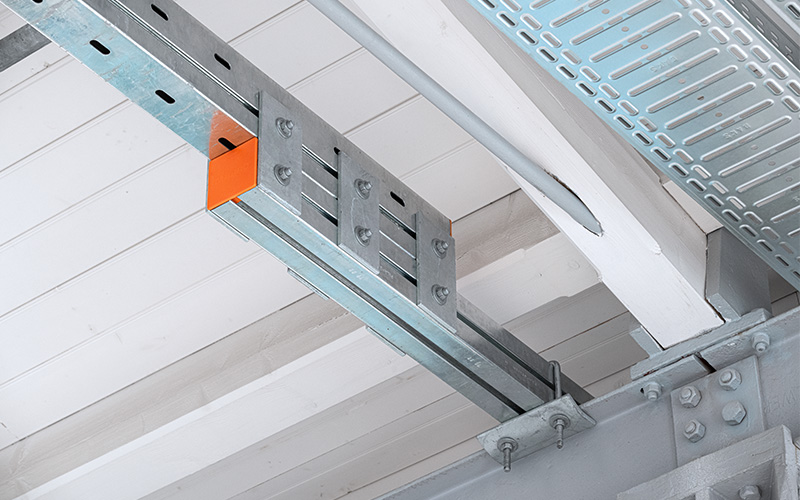 En raison de la capacité de charge limitée du toit, MÜPRO a résolu le problème de fixation des installations de conduites à l'aide d'une grille de plafond composée de rails fixés aux poutres en acier.