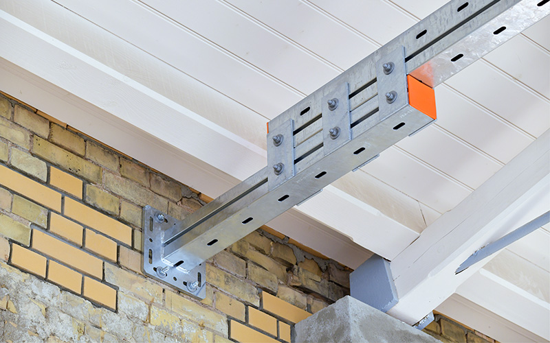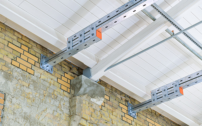 En raison des exigences en matière de protection des monuments historiques, les câbles doivent être principalement fixés au plafond dans le cadre de ce projet. Parallèlement, la toiture en bois du bâtiment présente une capacité de charge limitée, ce qui empêche de l'utiliser dans les proportions habituelles pour ces fixations. Les poutres en acier pouvant être utilisées comme alternative pour la fixation présentent toutefois des portées inhabituellement grandes, de huit mètres au lieu des six mètres habituels aujourd'hui, qui doivent être comblées. Cela entraîne également une charge accrue sur les différents rails.