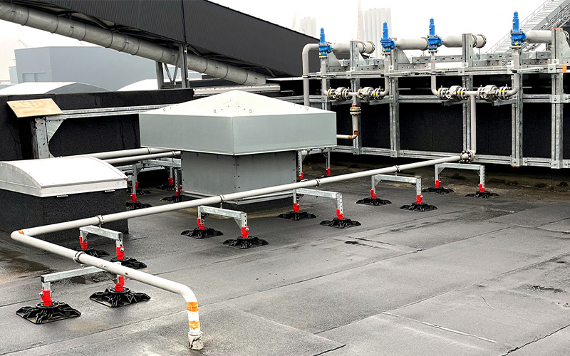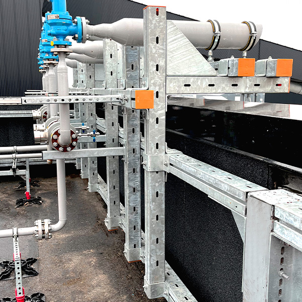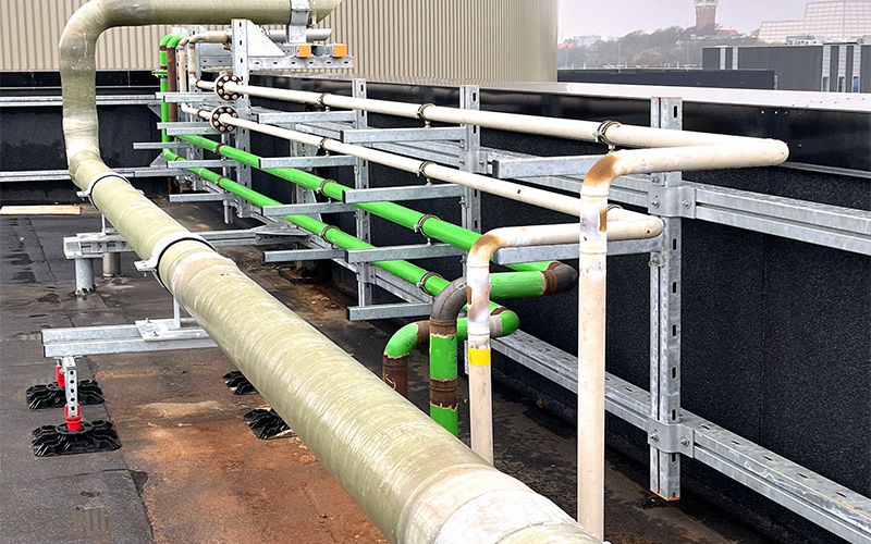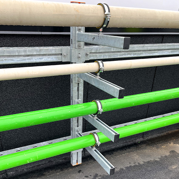 À Esbjerg, le système MPT a été combiné avec des éléments des systèmes MPR et MPC. MÜPRO a pu s'appuyer sur une large gamme de produits de fixation et ainsi réaliser ce projet de grande envergure avec précision. Le système MPT complet se compose de profilés galvanisés à chaud, résistants à la corrosion et pouvant être utilisés aussi bien à l'intérieur qu'à l'extérieur. La technique de fixation est également utilisée pour la pompe à chaleur à eau de mer, tant à l'intérieur de l'atelier que à l'extérieur. MÜPRO fournit ainsi la fixation adaptée à chaque usage.