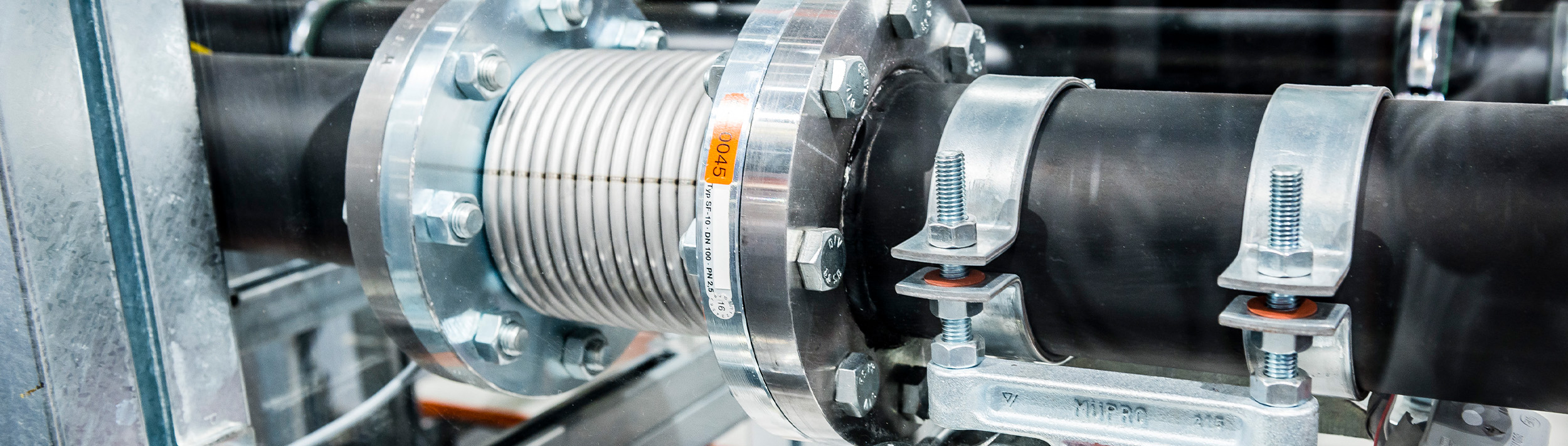 La distance des supports de guidage par rapport au compensateur est déterminée par calcul, ce qui permet également d’évaluer les forces aux points fixes. Par exemple, un tuyau de 200–300 mm de diamètre avec une pression d’essai de 5–6 bars peut générer une force de plusieurs tonnes.